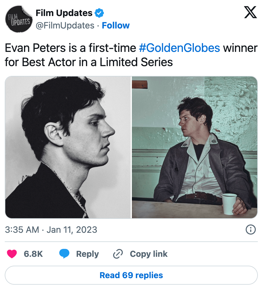 Evan Peters’ harrowing, but brilliant performance in Dahmer won him the Golden Globe for Best Performance by an Actor in a Limited Series or Television Film. His success has come full circle with a career defining moment portraying a murderer, stemmed from his big break as the murderous teenager Tate Langdon in American Horror Story. From teen to top dog, we cannot wait to see what he does next.