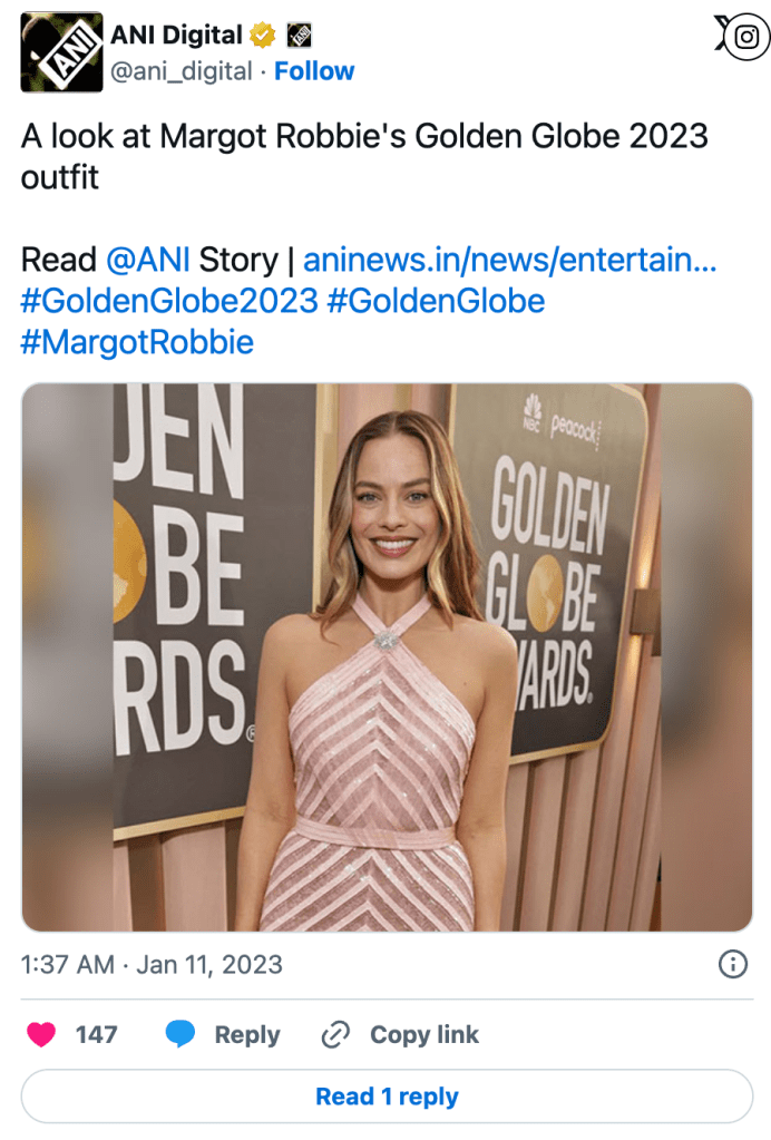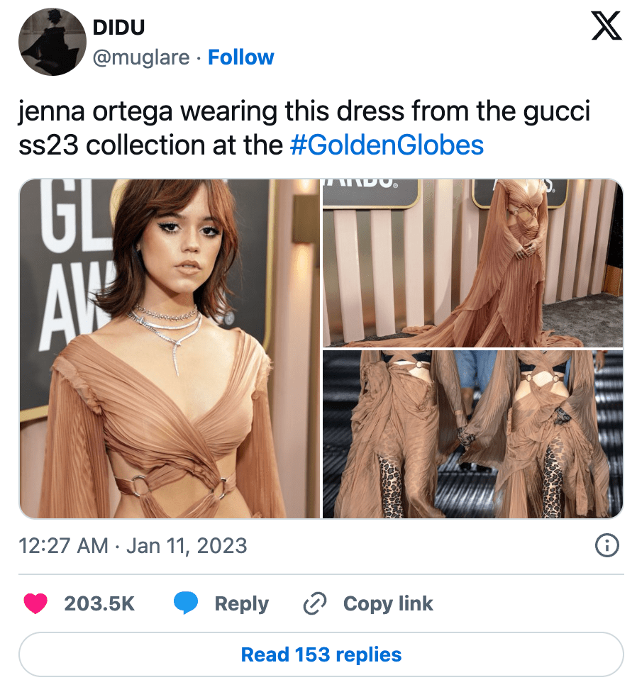 Next up is Wednesday star, Jenna Ortega. Departing from the darker hues she’s been wearing while on the press circuit for her hit TV show, for the Golden Globes she opted for a tan, almost coral Gucci dress. Cherry-picked from the House’s SS23 collection, Ortega looked glam down to the toes. The gown features criss-cross cutouts, while intricately pleated sleeves and a skirt float and flow, making Ortega look like a billowing dream. With stunning silver necklaces matching the hardware in the dress, this look is *chef’s kiss*.